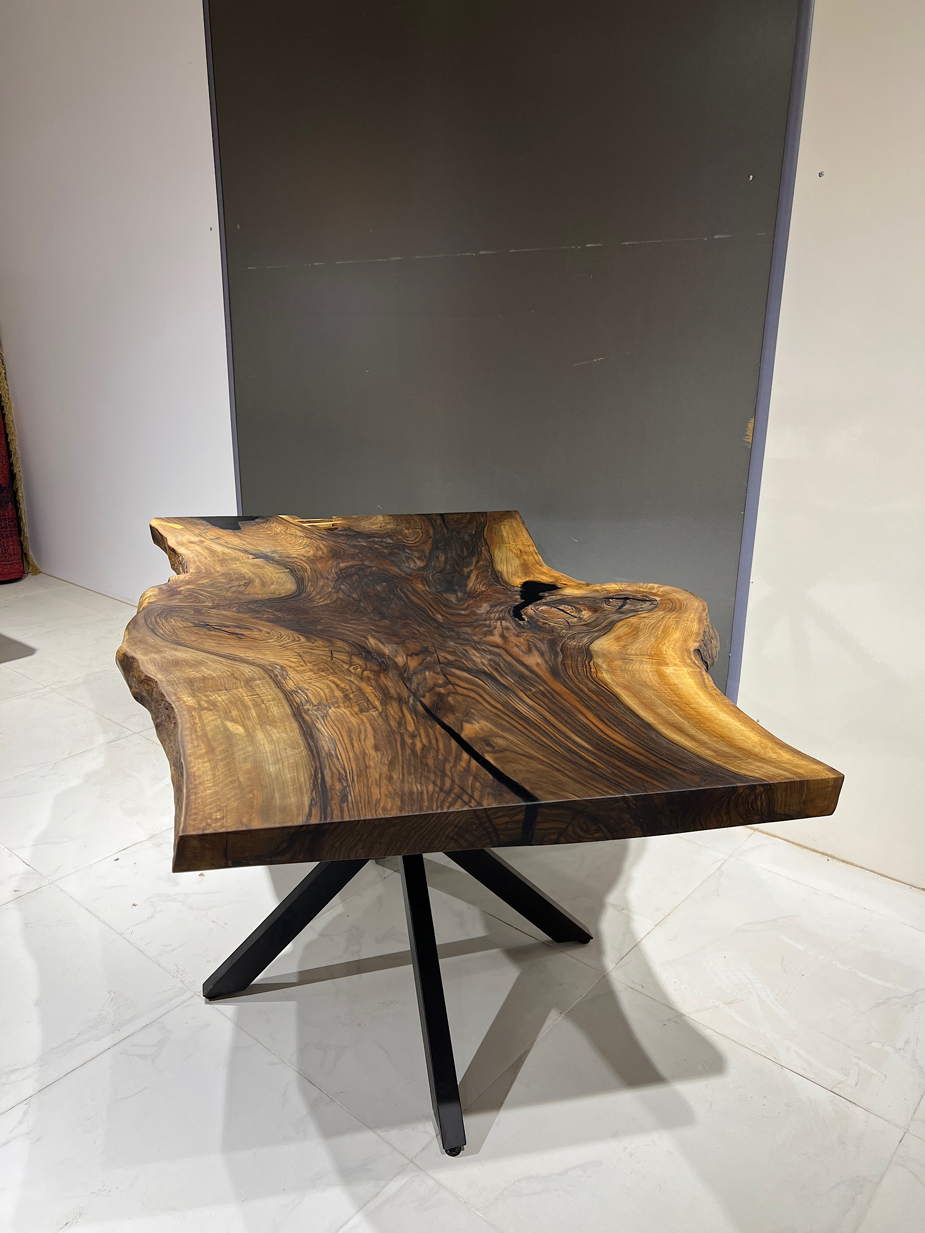 این میز ناهار خوری از یک اسلب گردو ی دو رنگ ساخته شده است. میز هایی که از چوب های قطور ساخته شده اند به علت کهنسال بودن درخت و کمیاب بودن چوب آنها از ارزش بالایی برخوردار هستند.