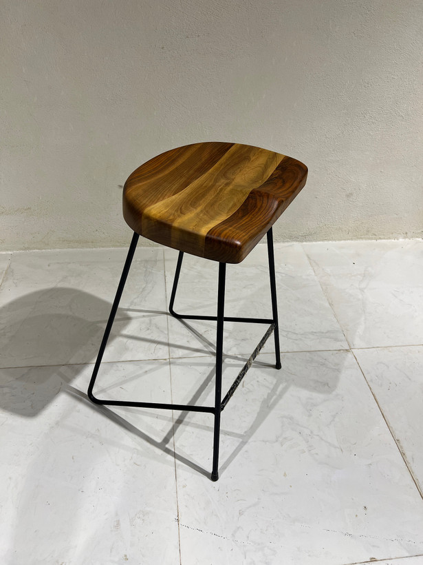 صندلی کانتر، اوپن، با نشیمن چوب گردو طبیعی خوش طرح و نقش . اندازه نشیمن حدود 30 الی 40سانیمتر است و از پوشش روغن گیاهی طبیعی مخصوص چوب برای پوشش سطح چوب استفاده شده است. پایههای این صندلی فلزی با میلگرد 12میل و در رنگ مشکیِ کورهای ساخته شده است.