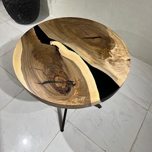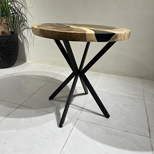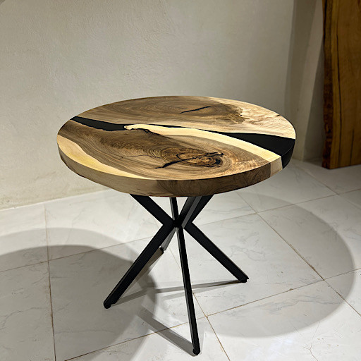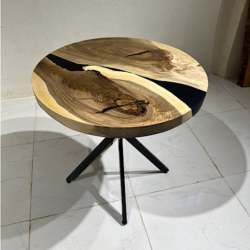 این میز ناهار خوری از در کنار هم قرار گرفتن دو چوب از درخت گردو ساخته شده است. فرم هندسی و گرد آن میتواند به سادگی محیط کمک شایانی کند. پایه ی این محصول آهنی بوده و پوشش نهایی آن رنگ کوره ای مشکی میباشد. پوشش نهایی این محصول به صورت خود رنگی و با بهره گیری از رنگ گیاهی ایجاد شده است.